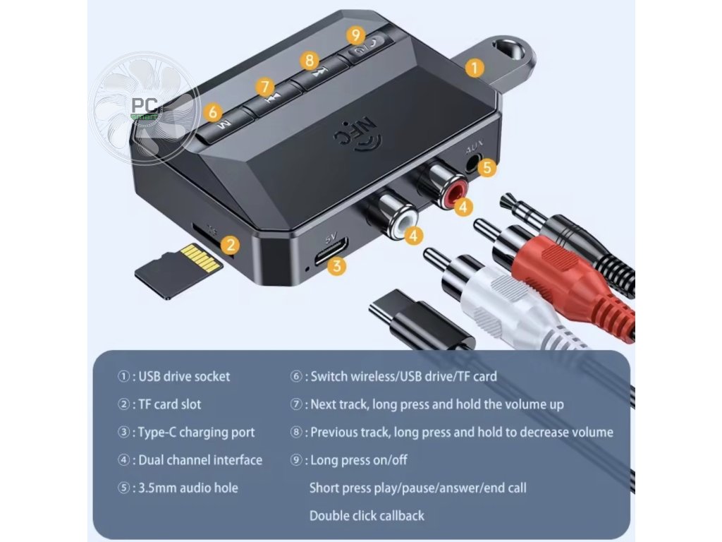 • Csomag tartalma: 1x NFC Bluetooth 5.3 Audio Receiver, 1x 3.5 mm AUX kábel, 1x Type-C tápcsatlakozó kábel, 1x RCA audio kábel, 1x felhasználói útmutató